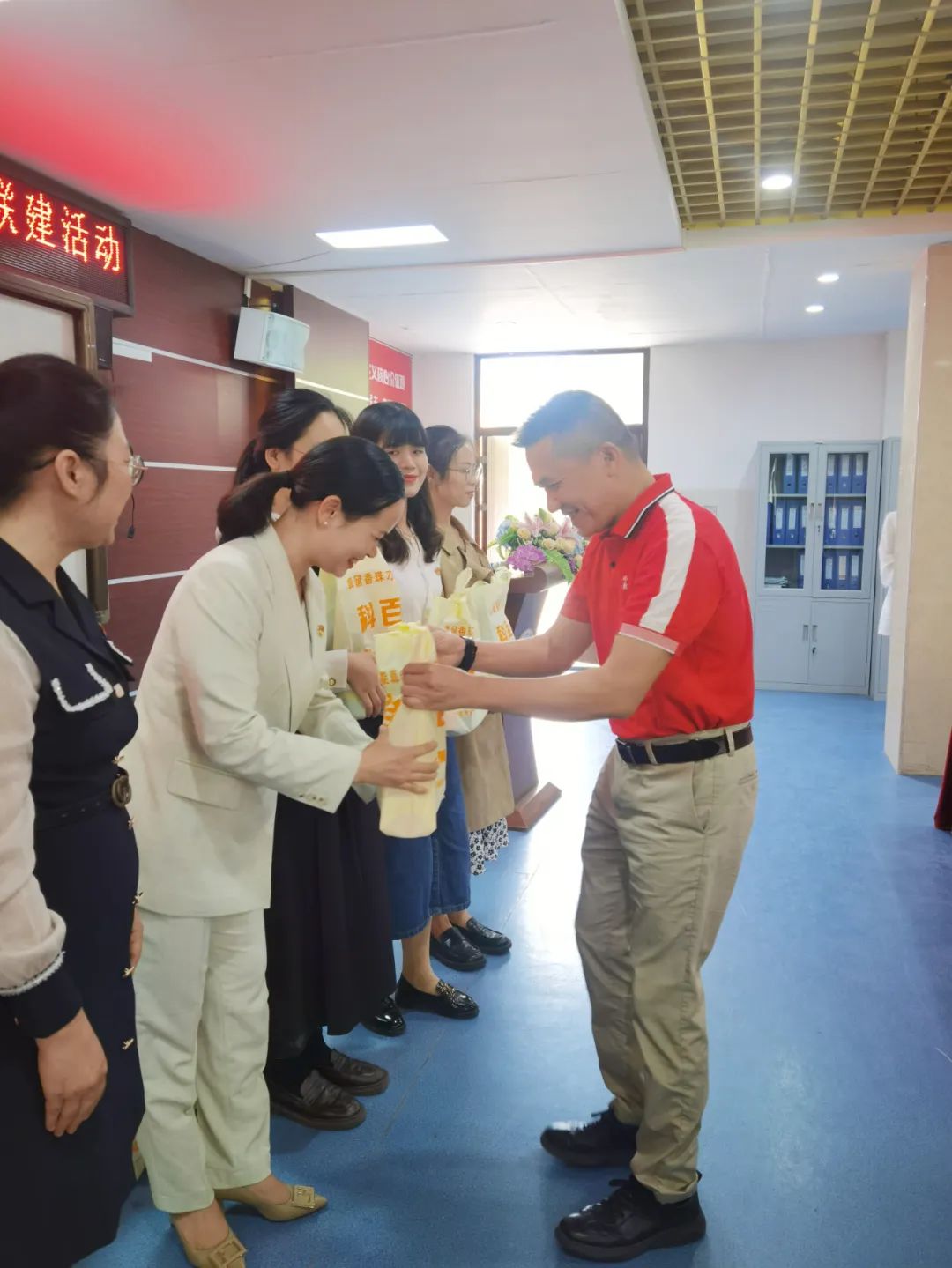 (和桂集團黨支部書記周云為教師們送上禮品)