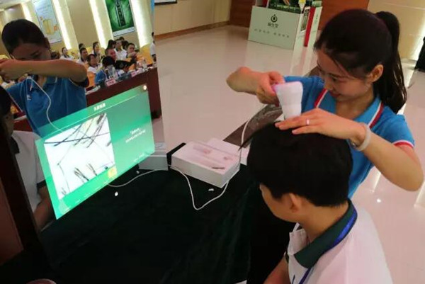 市場(chǎng)部總監(jiān)甘斌在會(huì)上向大家介紹了,源生堂獨(dú)家定制開(kāi)發(fā)的4.0版本的頭皮智能檢測(cè)儀——“魔鏡”。他表示,“魔鏡的三大保障:魔鏡的智能化、專(zhuān)業(yè)化、多媒體功能給顧客帶來(lái)科學(xué)的檢測(cè)”。魔鏡從專(zhuān)業(yè)的角度,系統(tǒng)地將頭皮頭發(fā)的各種問(wèn)題分類(lèi)、分析,從整體到局部都能透徹地進(jìn)行評(píng)估,從而有助養(yǎng)發(fā)顧問(wèn)為顧客訂制最精確的護(hù)理方案。在眾多養(yǎng)發(fā)儀器中,頭皮檢測(cè)儀是最重要的儀器之一,它用來(lái)檢測(cè)頭發(fā)問(wèn)題的根源,讓消費(fèi)者清晰地看到自己頭發(fā)的養(yǎng)護(hù)前和養(yǎng)護(hù)后的對(duì)比照,及時(shí)了解頭皮健康狀況。
