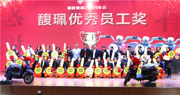 (廣東雅娜集團(tuán)有限公司總裁呂在坤和集團(tuán)常委頒發(fā)年度“馥珮”優(yōu)秀員工獎(jiǎng),每人一輛電動(dòng)車(chē))