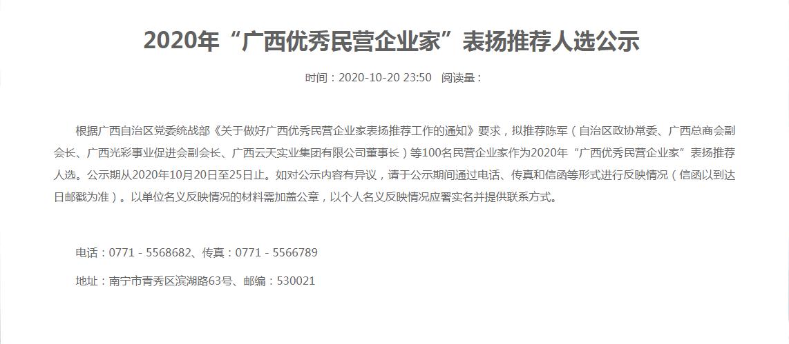 10月29日,在廣西第一個(gè)“民營企業(yè)家日”到來之際,自治區(qū)黨委統(tǒng)戰(zhàn)部、自治區(qū)工商聯(lián)、自治區(qū)非公有制經(jīng)濟(jì)工作領(lǐng)導(dǎo)小組辦公室對100名優(yōu)秀民營企業(yè)家進(jìn)行通報(bào)表揚(yáng),和桂集團(tuán)總裁黃偉文實(shí)力入選。