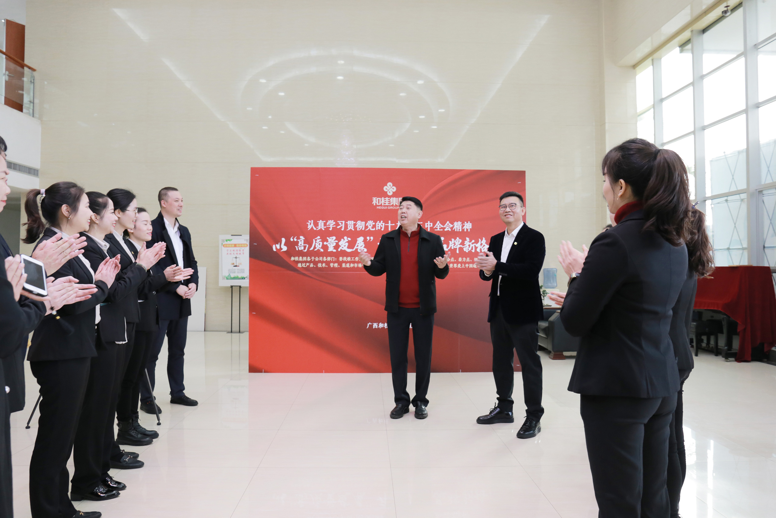 南寧市委統(tǒng)戰(zhàn)部副部長(zhǎng)、市工商聯(lián)黨組書記李忠南,認(rèn)真?zhèn)鬟_(dá)了黨的十九屆五中全會(huì)精神,號(hào)召大家學(xué)習(xí)勞模精神、工匠精神,做新時(shí)期的奮斗者。通過(guò)生動(dòng)的視頻和案例,特別是外籍人士對(duì)中國(guó)的認(rèn)識(shí),以及對(duì)戰(zhàn)斗英雄、國(guó)家功勛李延年故事的講述,讓大家感受到幸福來(lái)之不易,紛紛表示要做愛國(guó)敬業(yè)、守法經(jīng)營(yíng)、創(chuàng)業(yè)創(chuàng)新和回報(bào)社會(huì)的先鋒。同時(shí),肯定了和桂集團(tuán)作為民營(yíng)企業(yè),堅(jiān)定信念,跟黨走,聽黨話,以高質(zhì)量發(fā)展,開創(chuàng)民族品牌新格局。