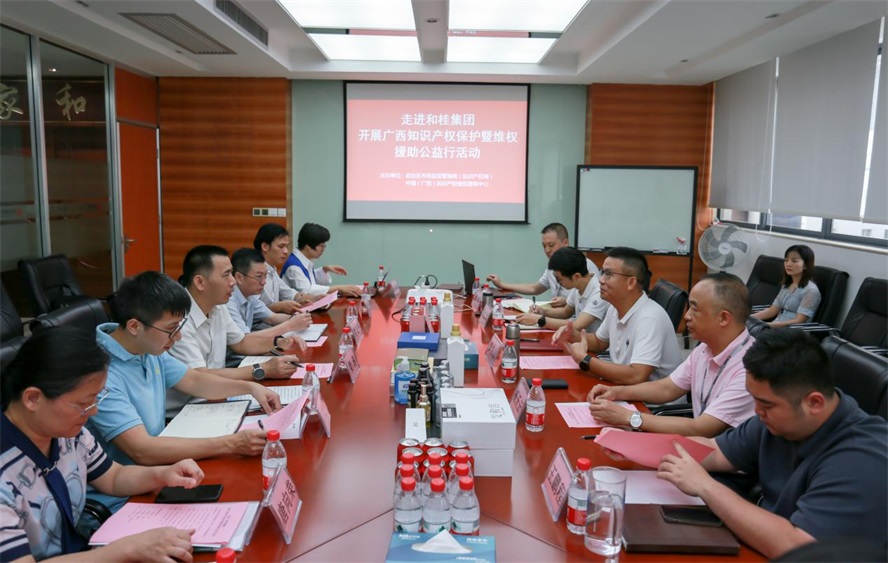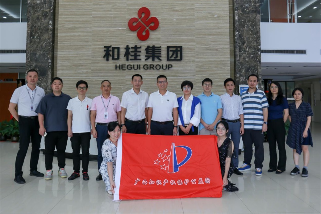 8月12日,自治區(qū)市場(chǎng)監(jiān)督管理局知識(shí)產(chǎn)權(quán)保護(hù)處處長梁濤一行蒞臨和桂集團(tuán)開展調(diào)研。南寧市市場(chǎng)監(jiān)督管理局副局長謝義平、自治區(qū)市場(chǎng)監(jiān)督管理局知識(shí)產(chǎn)權(quán)保護(hù)處一級(jí)主任科員張文軍、中國(廣西)知識(shí)產(chǎn)權(quán)維權(quán)援助中心維權(quán)援助部部長謝玲玲攜知識(shí)產(chǎn)權(quán)專家組陪同調(diào)研。專家組重點(diǎn)了解企業(yè)發(fā)展現(xiàn)狀以及相關(guān)商標(biāo)專利等知識(shí)產(chǎn)權(quán)情況。和桂集團(tuán)董事長黃偉文攜集團(tuán)高管熱情接待。
